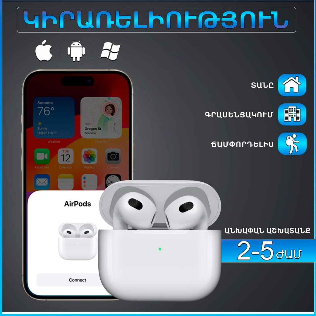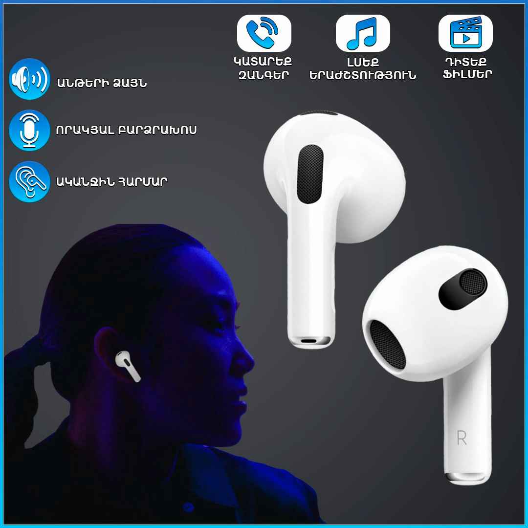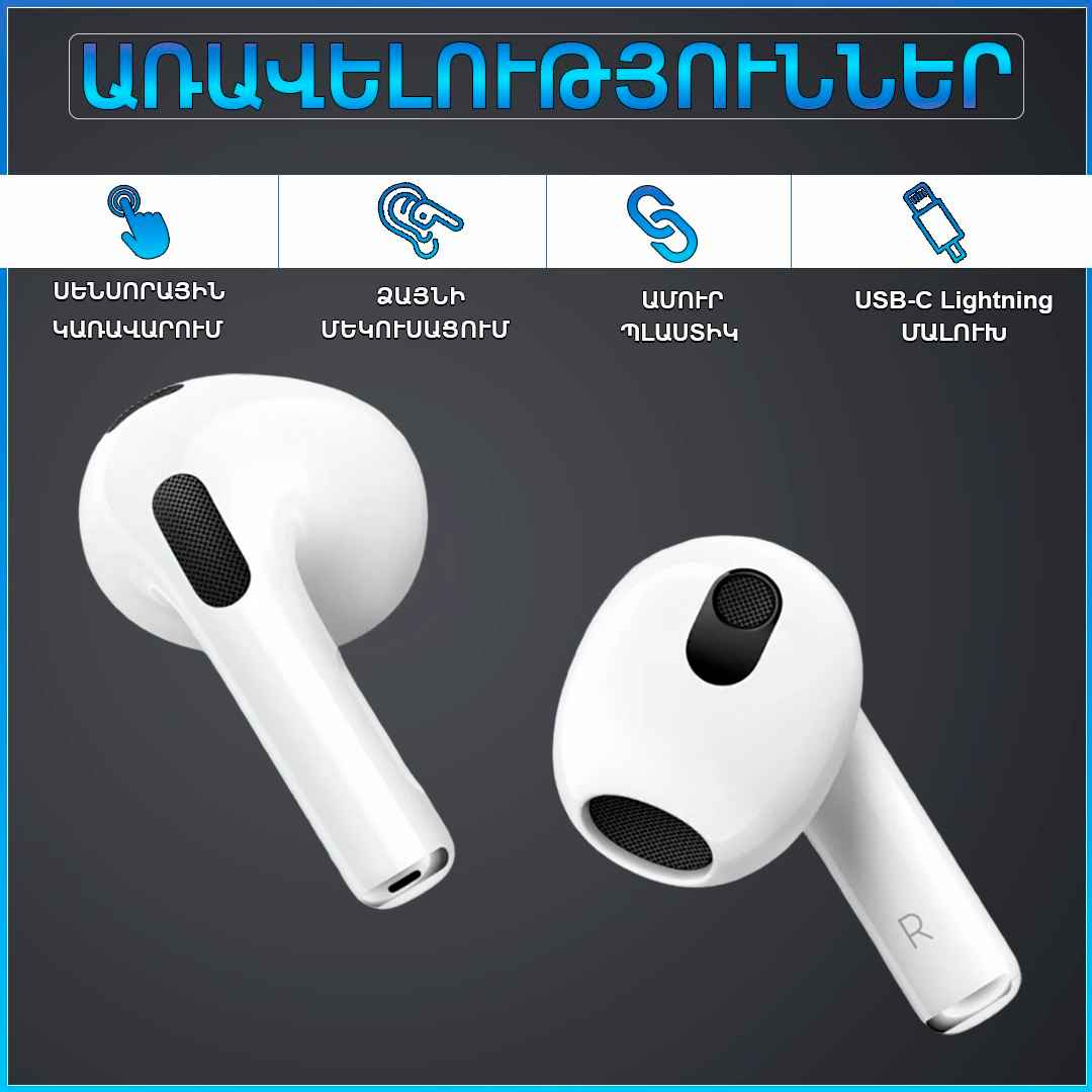 Լավագույն որակի անլար ականջակալը Իր տեսակների մեջ Luxury որակ Օրիգինալից չտարբերվող Որակյալ հնչողություն Սենսորային կառավարում Գերազանց միկրոֆոն Աշխատանք։ 5 ժամ Գույն։ Սպիտակ Սնուցում։ Lightning