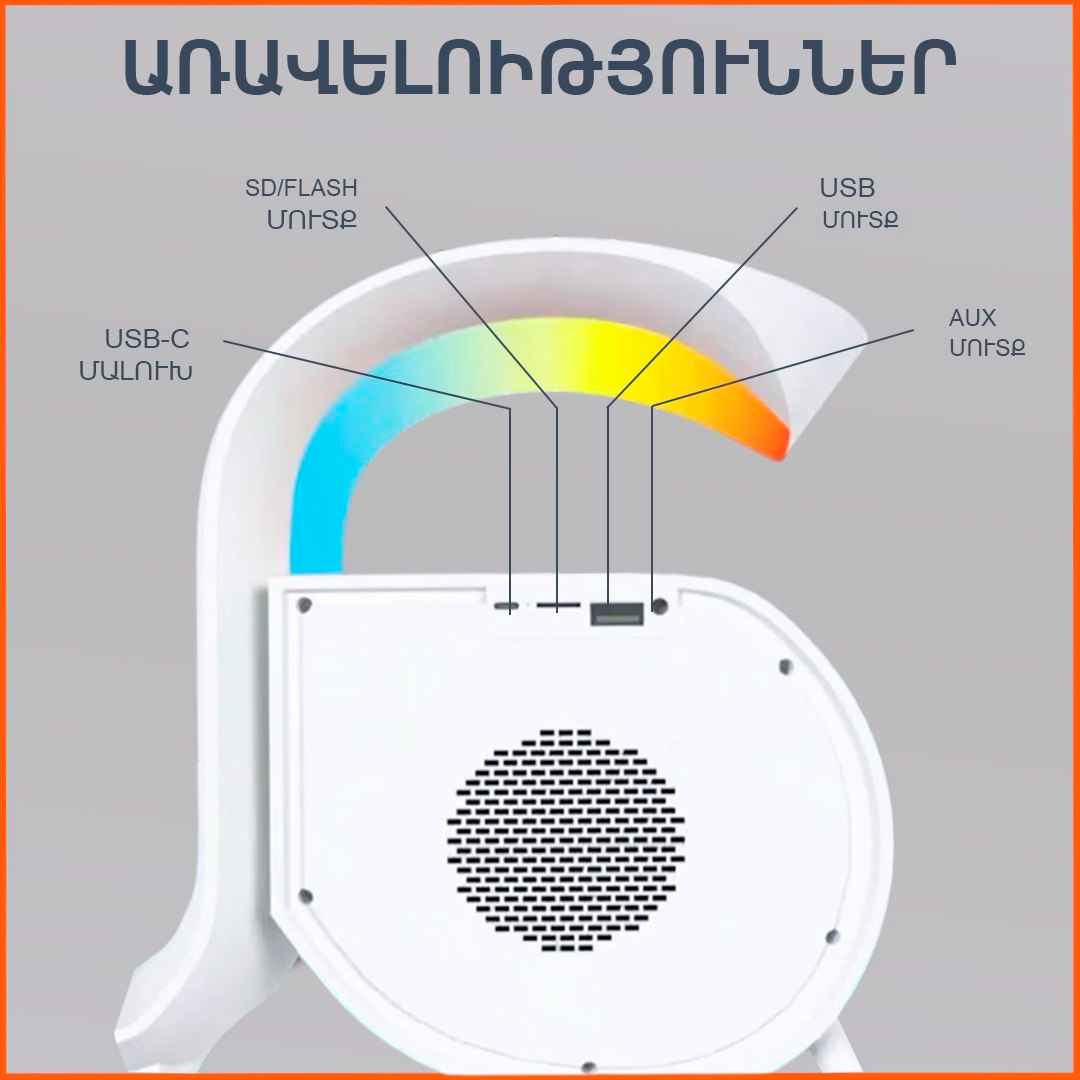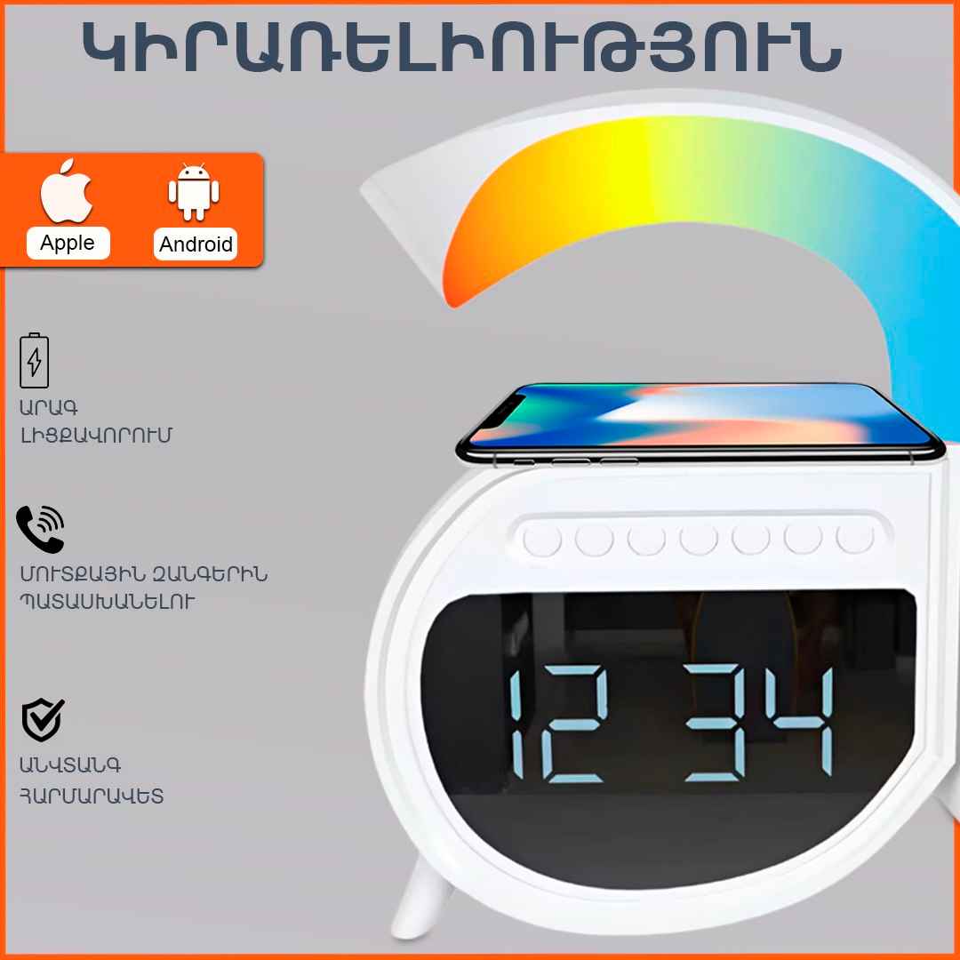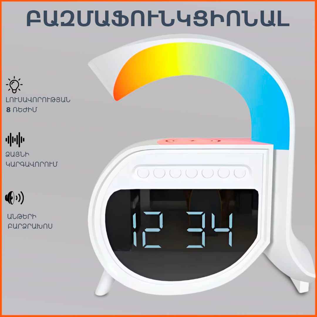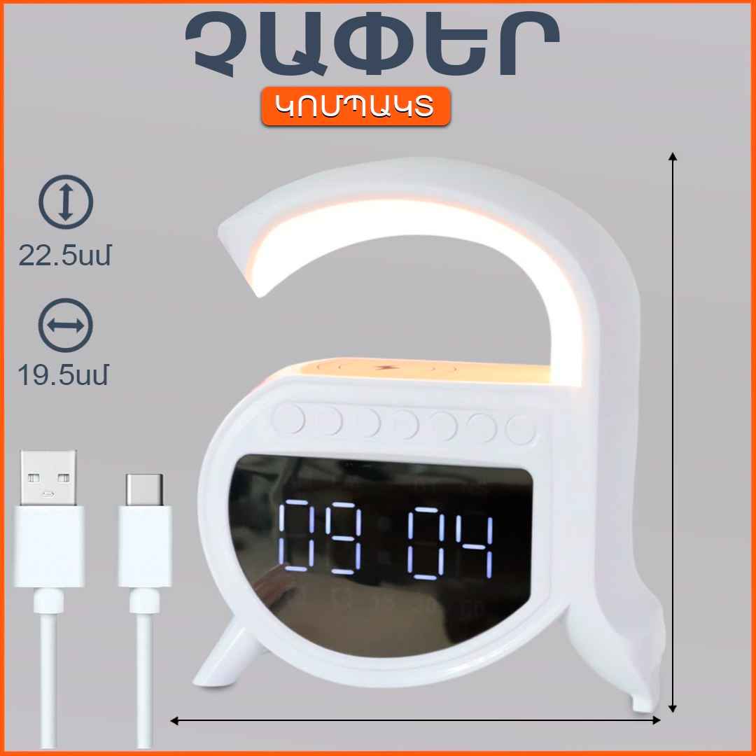 Անլար լիցքավորիչ LED լույս Բարձրախոս Radio-FM Ժամացույց Զարդուցիչ SD/Flash/AUX հնարավորություն Այս ամենը մեկ օրգանայզերի մեջ
